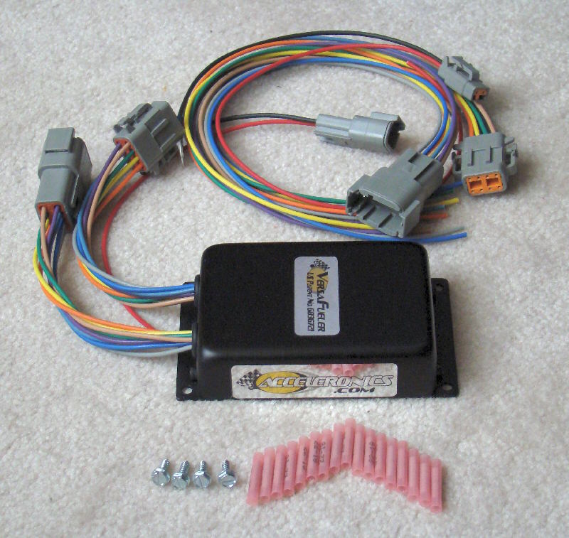 The Acceleronics VersaFueler (US Patent 6836721) simply splices in between your current ECU and the big honkin' injectors that your monster motor needs. Splice it in, hook it up to switched 12-volts and ground, and you're on your way to the races. The VersaFueler provides separate "peak and hold" logic circuits for each injector. The "peak" supplies up to 4 amps to snap huge injectors open quickly, something your ECU cannot do. Once the injector is open, the "hold" turns down the current to prevent the injector from overheating. Your ECU will never know that it's running the Acceleronics VersaFueler instead of the injectors. The VersaFueler will not cause your engine control computer to "throw a code", or turn on the check engine light, or do anything else that would be annoying. The VersaFueler comes with everything you need for installation. The locking connectors are dustproof and waterproof. Inside the anodized aluminum enclosure, all circuits are encapsulated to make them resistant to moisture, dust and vibration. The Acceleronics VersaFueler is designed to provide years of trouble-free service. |